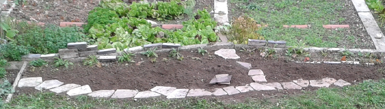 Od kompostnega kupa naprej sem s potko zavila in kose porfida vlagala v zemljo z razmikom. So šli že zelo proti koncu. Dokler je šlo, oz. do tam kjer je koreninski splet visokih smrek tako gost na površini tik pod trato, da tega nisem mogla več početi. Ta del leži pod drugo razmejitvijo. Za njimi so položeni betonski zidaki v katerih rastejo najrazličnejše rastline.